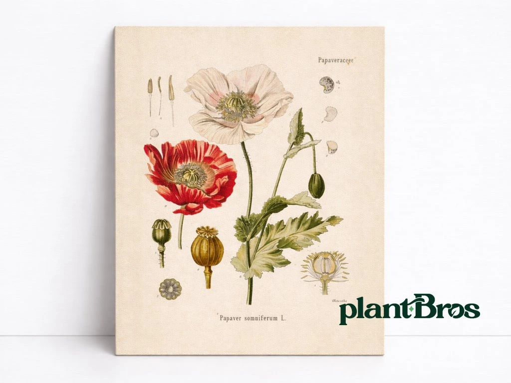 Elegantný obraz na plátne s botanickou ilustráciou rastliny Papaver somniferum – mak v štýle historických botanických atlasov. Detailná kresba zobrazuje kvety, listy aj plody maku v jemných prírodných farbách, ktoré vytvárajú nadčasový a estetický motív.