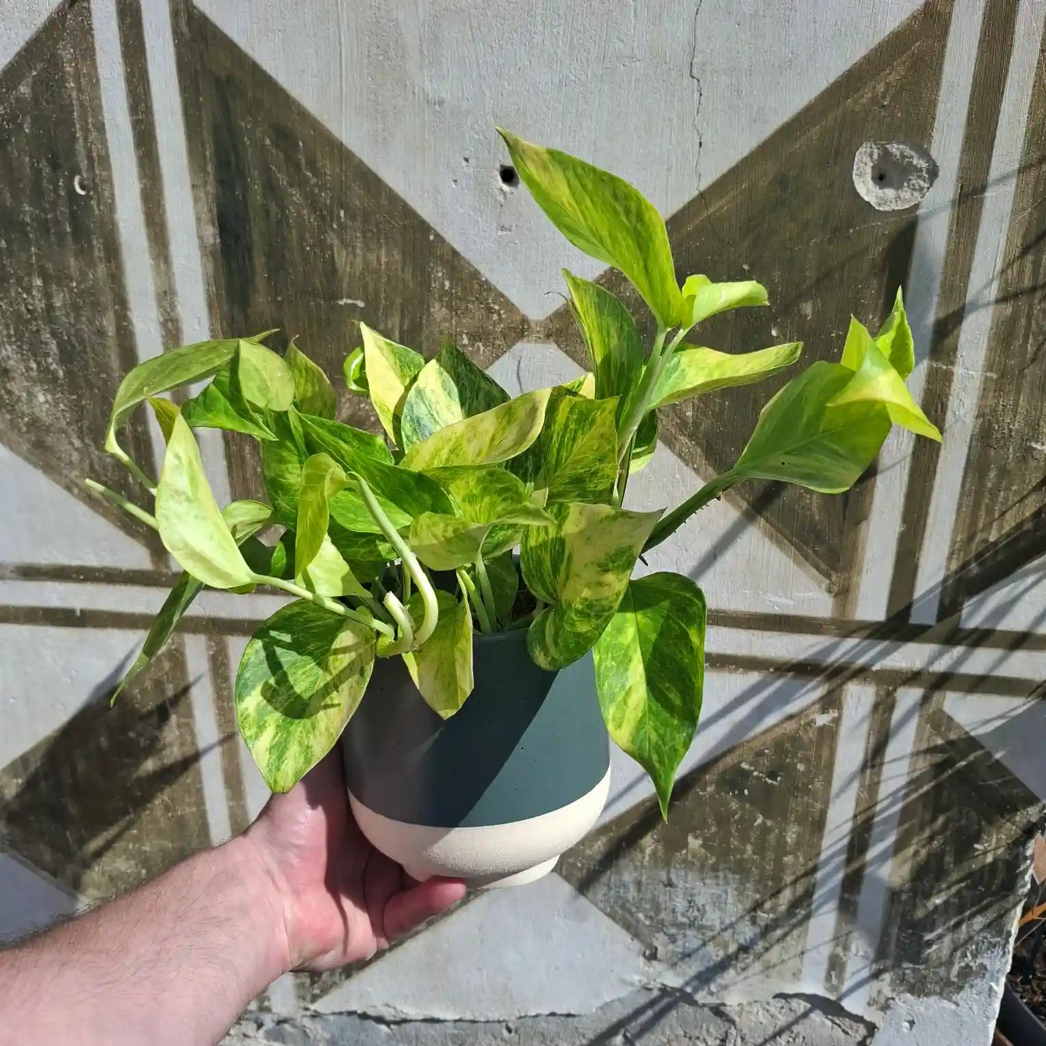 Epipremnum ‘Hicolor’ je unikátny a vizuálne výrazný kultivár pothosu, ktorý si získa pozornosť svojím nepredvídateľným panašovaním. Kombinuje sýtozelený základ s krémovobielymi a svetlozelenými mapami, ktoré dodávajú rastline svieži a umelecký vzhľad. Príroda ho vie vymaľovať ozaj pekne.