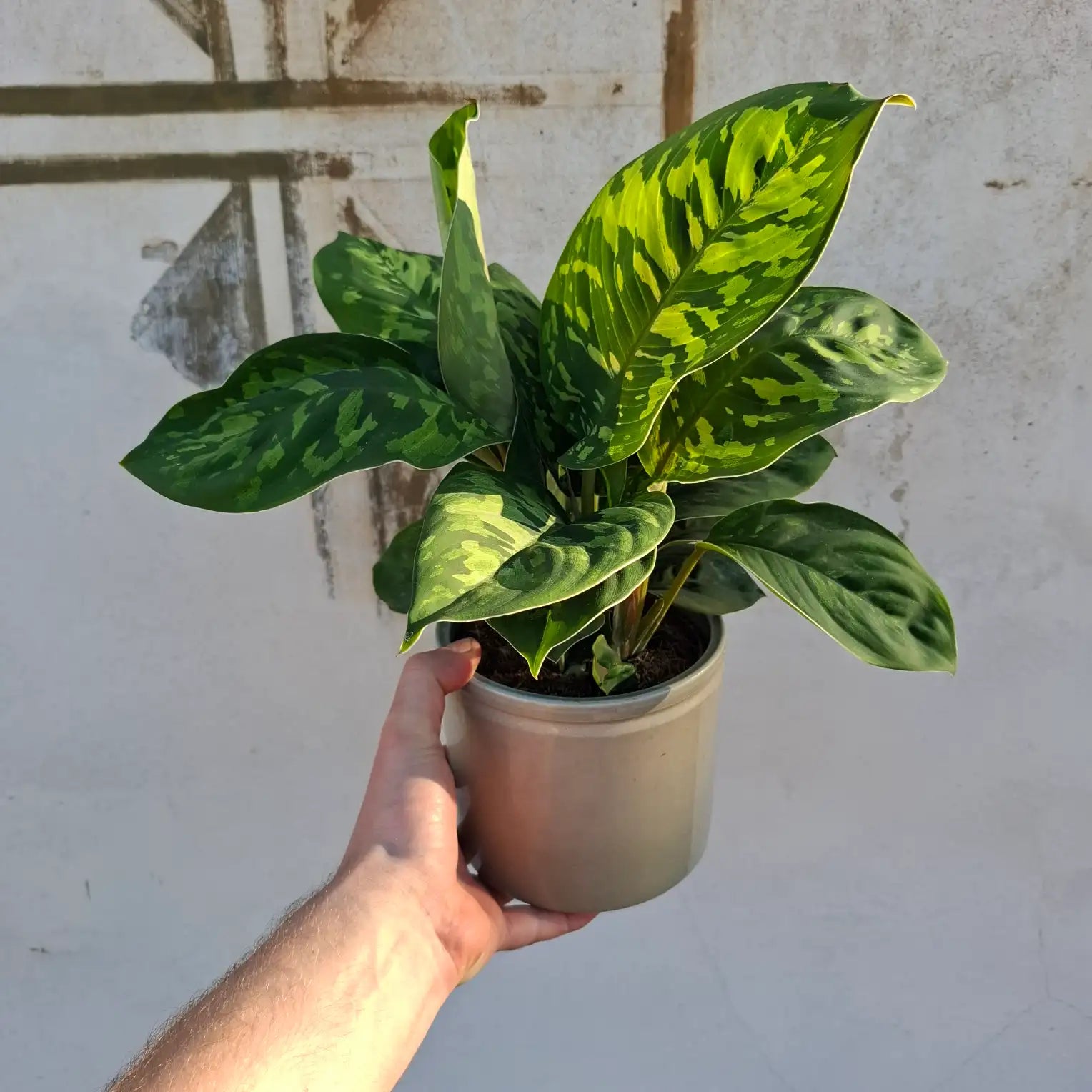 Homalomena ‘Camouflage’ je výnimočná izbová rastlina s listami, ktoré vyzerajú ako namaľované umelcom. Ich mramorovaný vzor v odtieňoch zelenej, olivovej a khaki pripomína prírodný kamuflážny vzor tropického pralesa. Ide o rastlinu s kompaktným, hustým rastom a exotickým vzhľadom, ktorá okamžite oživí interiér.