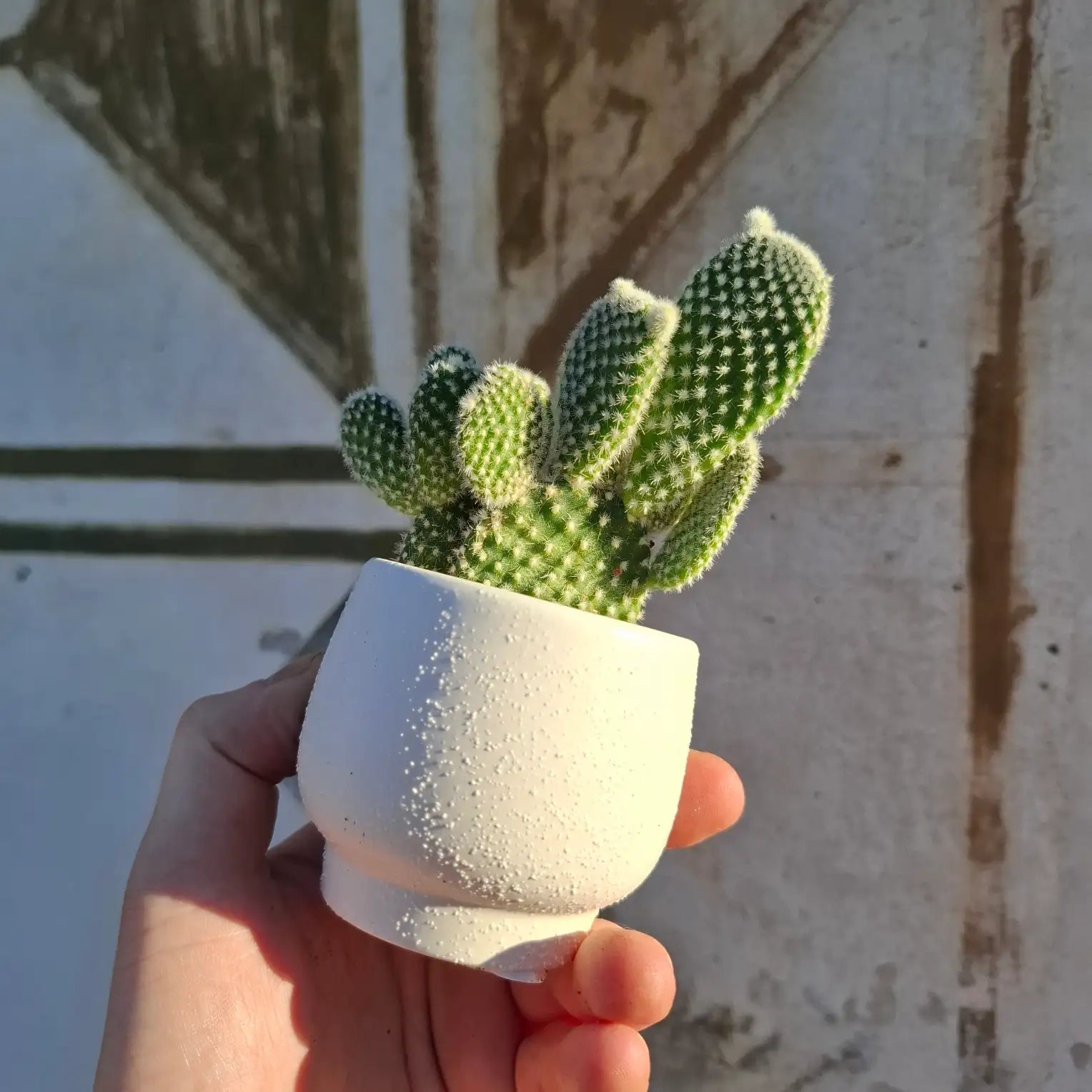 Opuntia microdasys, známa aj ako Bunny Ears Cactus alebo Mini opuncia, je ikonický druh kaktusu, ktorý si získal popularitu vďaka svojim plochým, okrúhlym článkom pripomínajúcim zajačie ušká. Pokrývajú ich drobné zlaté alebo biele trichómy, ktoré vytvárajú jemný, púdrový efekt. Tento kaktus je nenáročný, no pritom vizuálne pútavý – ideálny doplnok do moderných aj boho interiérov.