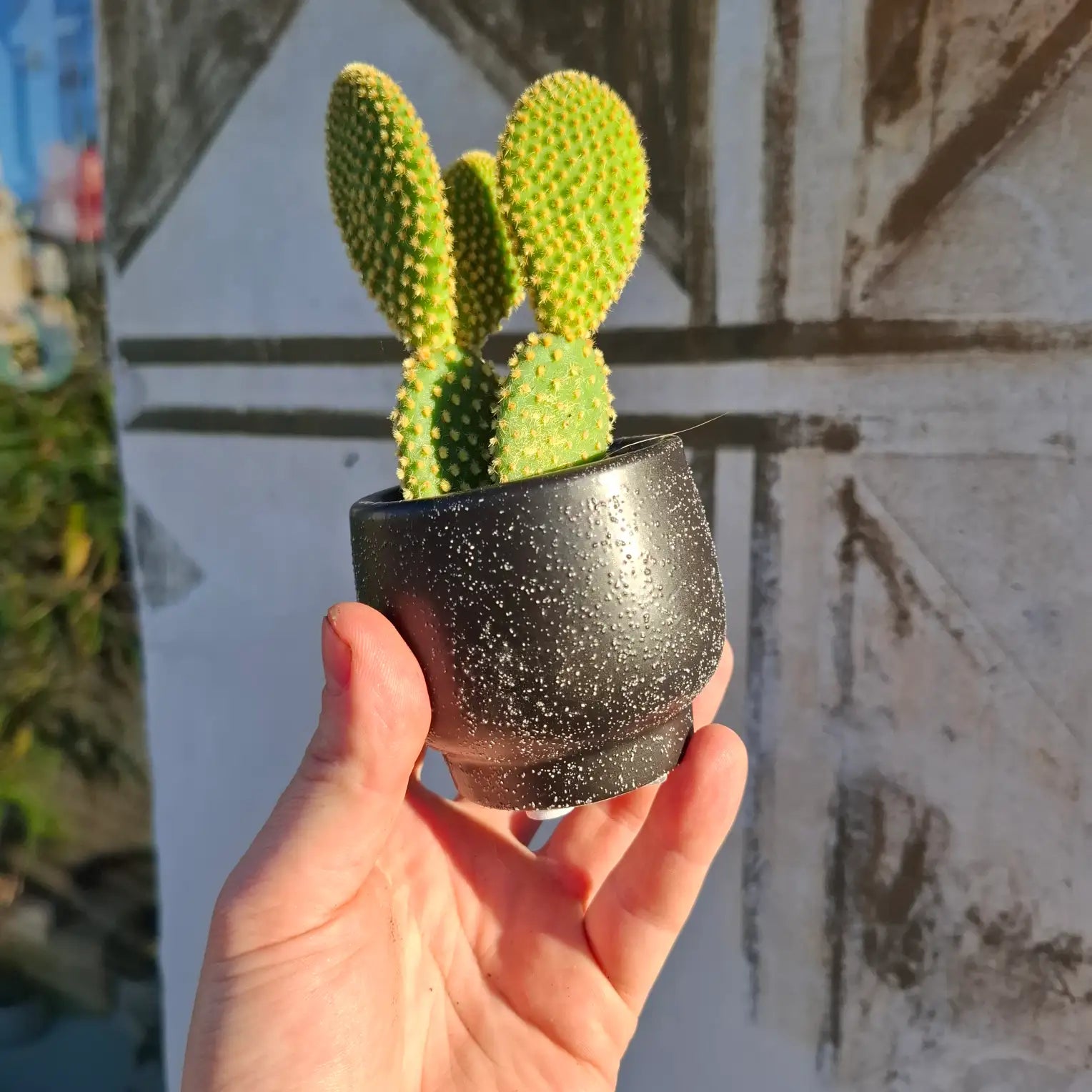 Opuntia microdasys, známa aj ako Bunny Ears Cactus alebo Mini opuncia, je ikonický druh kaktusu, ktorý si získal popularitu vďaka svojim plochým, okrúhlym článkom pripomínajúcim zajačie ušká. Pokrývajú ich drobné zlaté alebo biele trichómy, ktoré vytvárajú jemný, púdrový efekt. Tento kaktus je nenáročný, no pritom vizuálne pútavý – ideálny doplnok do moderných aj boho interiérov.